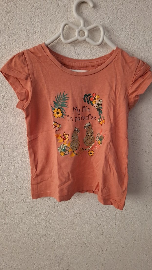 Turuncu renkli pamuk kız çocuk tişörtü, kısa kollu ve yuvarlak yaka. Bohem tarzda baskılı çiçek ve hayvan desenleri içerir. Size 92 cm