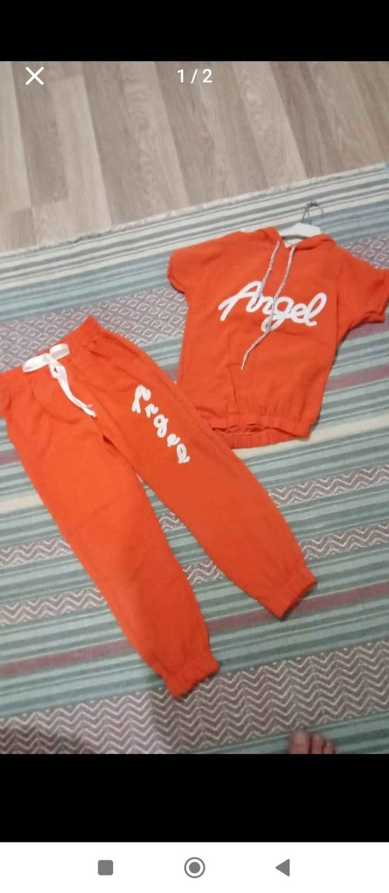 Renkli turuncu kız eşofman takımı, kısa kollu ve yuvarlak yaka olup, baskılı detaylar ve dantel süslemeler içerir. Rahat ve sıcak kumaştan, günlük sokak tarzı için uygundur. sıfır ürün yaş ve renk sorunuz