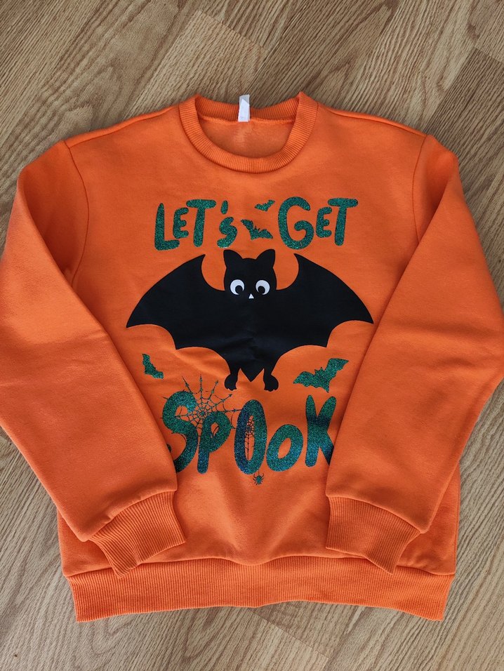 Uzun kollu, bisiklet yaka, bol kesim kız sweatshirt. Yumuşak ve sıcak kumaş, üzerinde yarasa ve 'Let's Get Spook' baskısı bulunur.