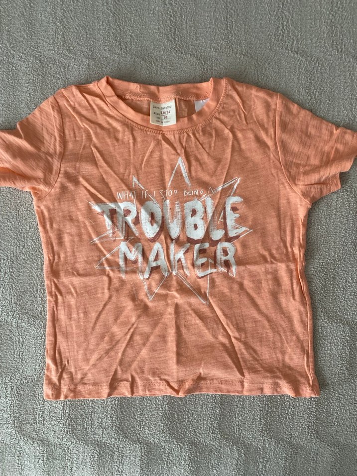 Turuncu pastel renkte, kısa kollu, yuvarlak yaka ve bol kesim kız tişörtü. Üzerinde 'Trouble Maker' baskısı bulunan sokak tarzı punk havası taşıyor.