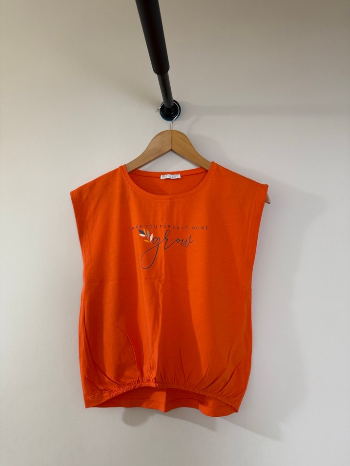 Pamuk kumaştan, kolsuz ve bol kesim turuncu renkli baskılı kadın tişört. Kısa ve rahat kesimiyle günlük sokak stiline uygun. Nk unsea markasıdır. 13 yaş.