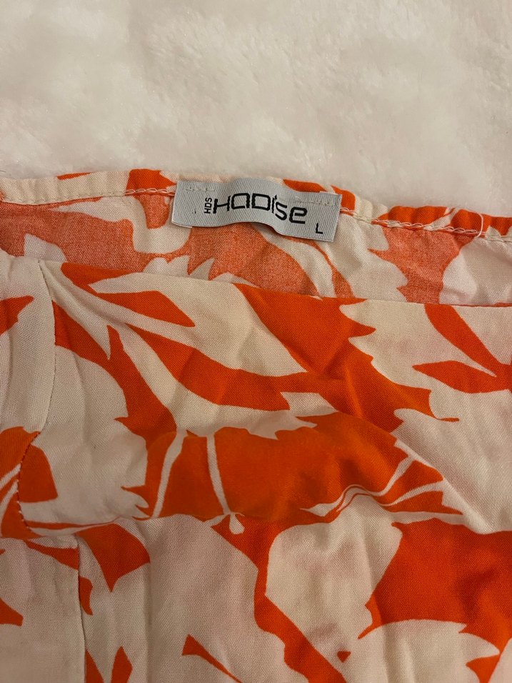 Turuncu ve beyaz baskılı, kolsuz, bol kesim mini elbise, sokak stilinde ve minimalist tasarıma sahip.