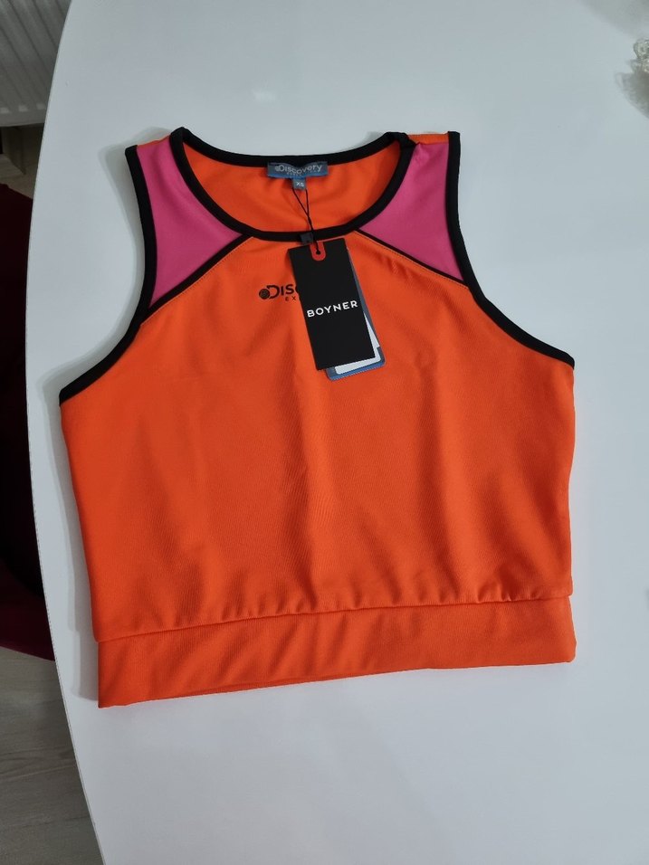 Kolsuz, fitted kesim ve yuvarlak yakalı turuncu spor üst. Sentetik kumaştan, renkli baskılı ve sokak stiliyle rahat ve şık görünüme sahip.