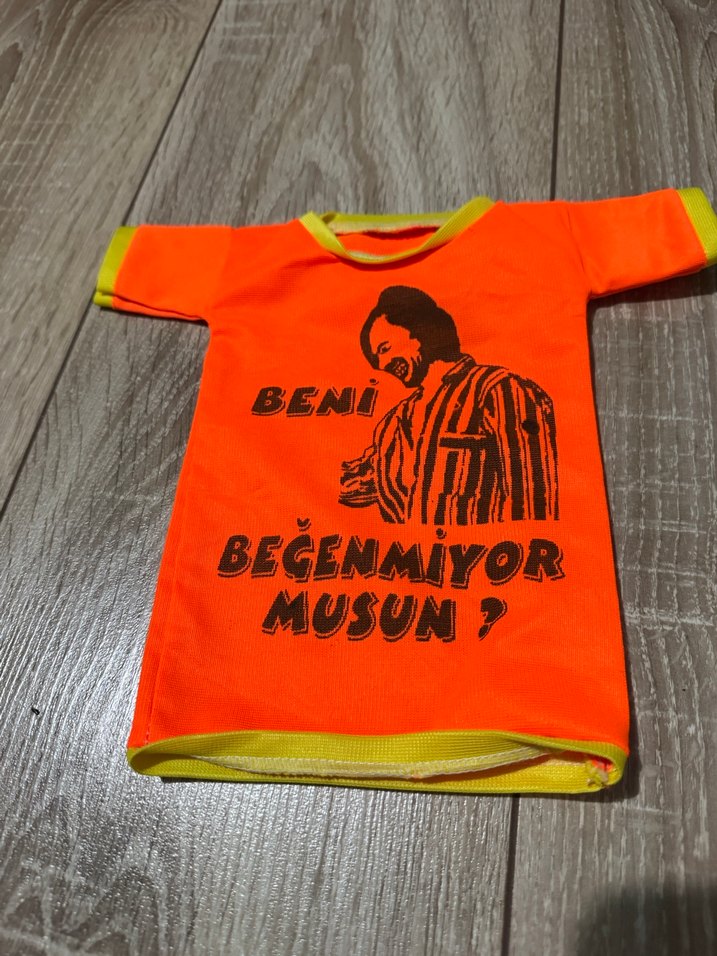 Turuncu renkli, sentetik kumaştan, oyun tişörtü. Baskılı 'BENİ BEĞENMİYOR MUSUN?' yazısı bulunur.