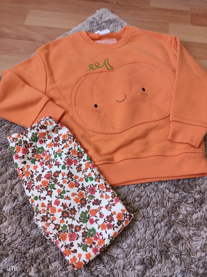 Turuncu uzun kollu üstü örme balkabağı desenli, renkli çiçek desenli pantolonlu kız takımı.