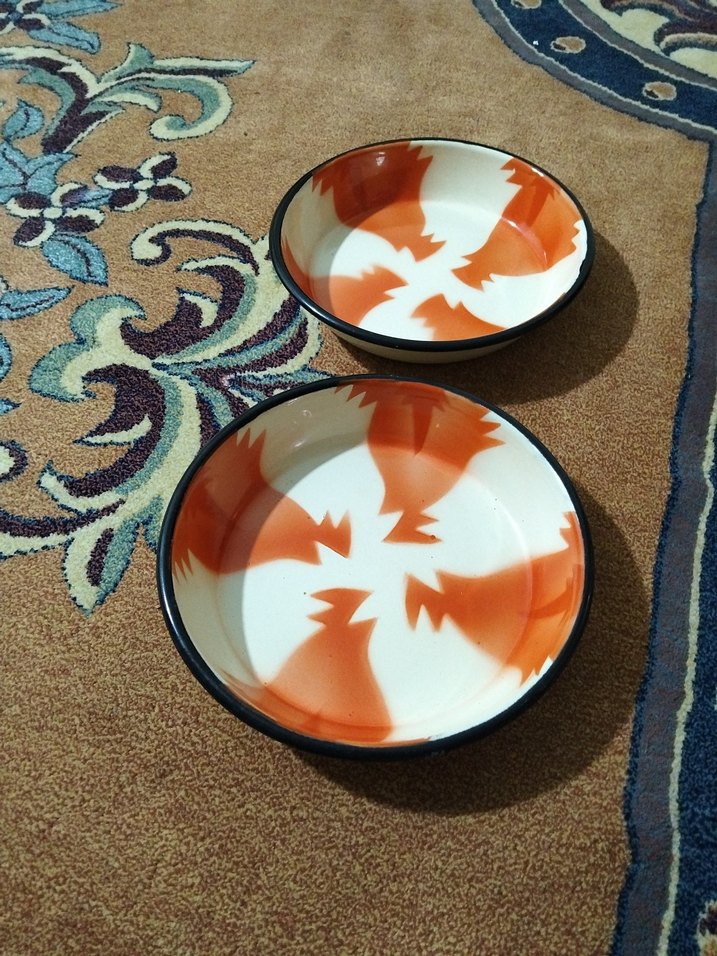 Turuncu ve beyaz batik desenli, renkli ve karşı kültür tarzında iki tabak seti. Masanıza canlılık katar. ️