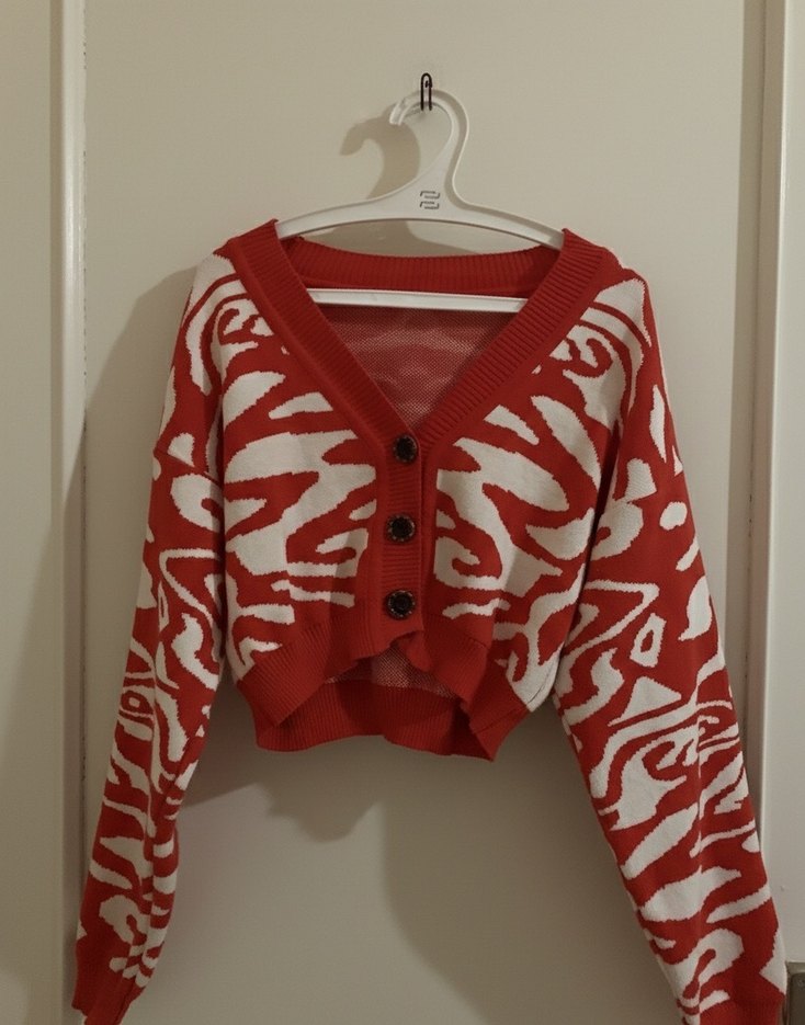 Kırmızı batik desenli, V yakalı, uzun kollu, örme kadın hırka. Bol kesim ve midi boyda, günlük kullanıma uygun. Düğmeli önü sokak modası stilinde.