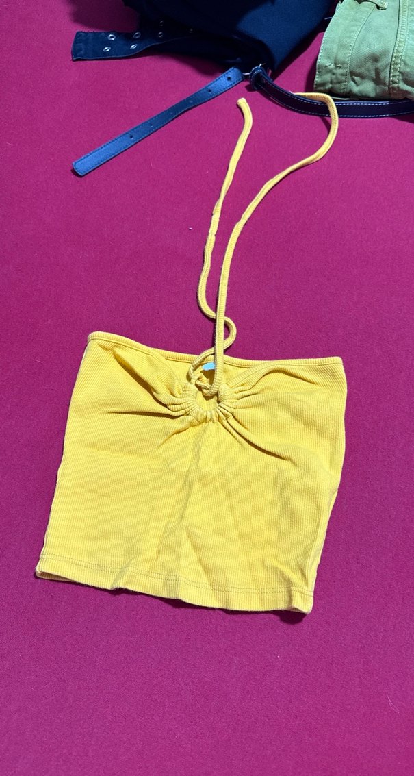Sarı, elastik sentetik kumaştan yapılmış, straplez yaka ve ince askılı, vücuda oturan crop top. Minimalist ve bohem tarzda, günlük kullanıma uygun.