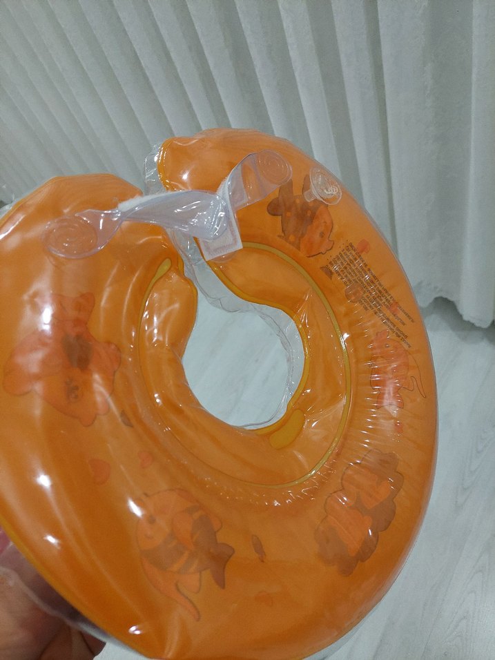 Turuncu renkli, bebekler için şişme boyun simidi, üzerinde renkli balık desenleri bulunur.