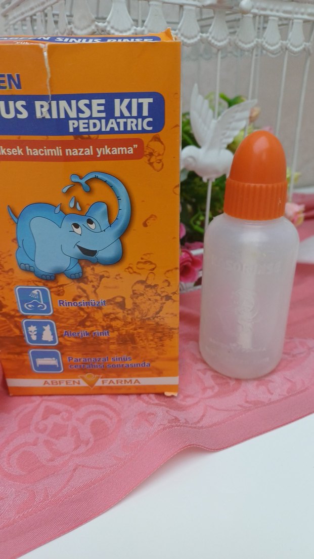 Turuncu renkli, yüksek hacimli nazal yıkama için pediatrik burun yıkama kiti. Sinüs ve alerji rahatlatıcıdır.