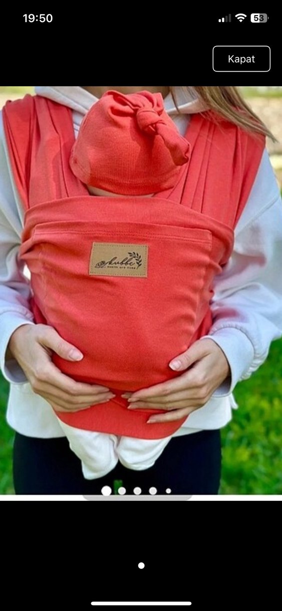 Pastel kırmızı renkte, yumuşak kumaşlı ve ayarlanabilir askılı bebek kanguru taşıyıcı. Hiç kullanılmadı.
