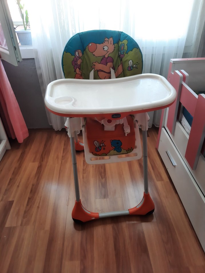 turuncu renkli, sevimli çizgi film desenli sırt dayamalı, beyaz çıkarılabilir tepsili ve dayanıklı metal ayaklı bebek mama sandalyesi. cihicco