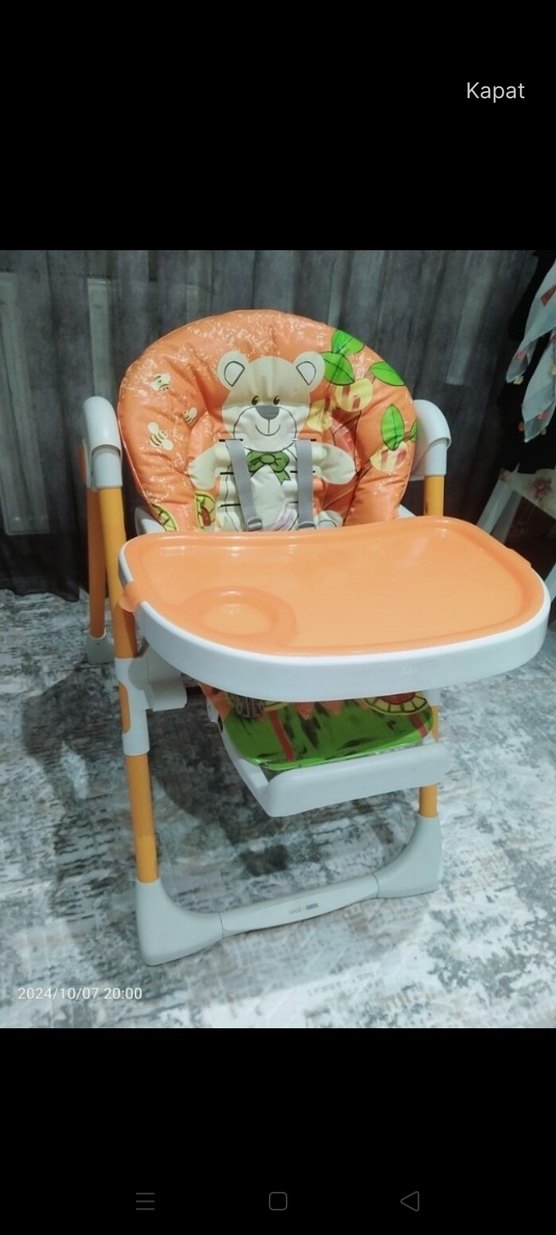 Turuncu renkli, ayı desenli yumuşak minderli bebek mama sandalyesi, çıkarılabilir tepsi ile kolay kullanım sağlar.
