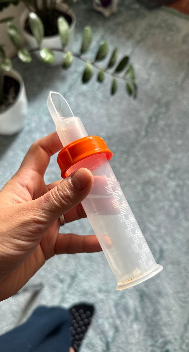 Turuncu kapaklı, ölçü işaretli renkli bebek besleme şırıngası, sıvı beslemeyi hassaslaştırır.