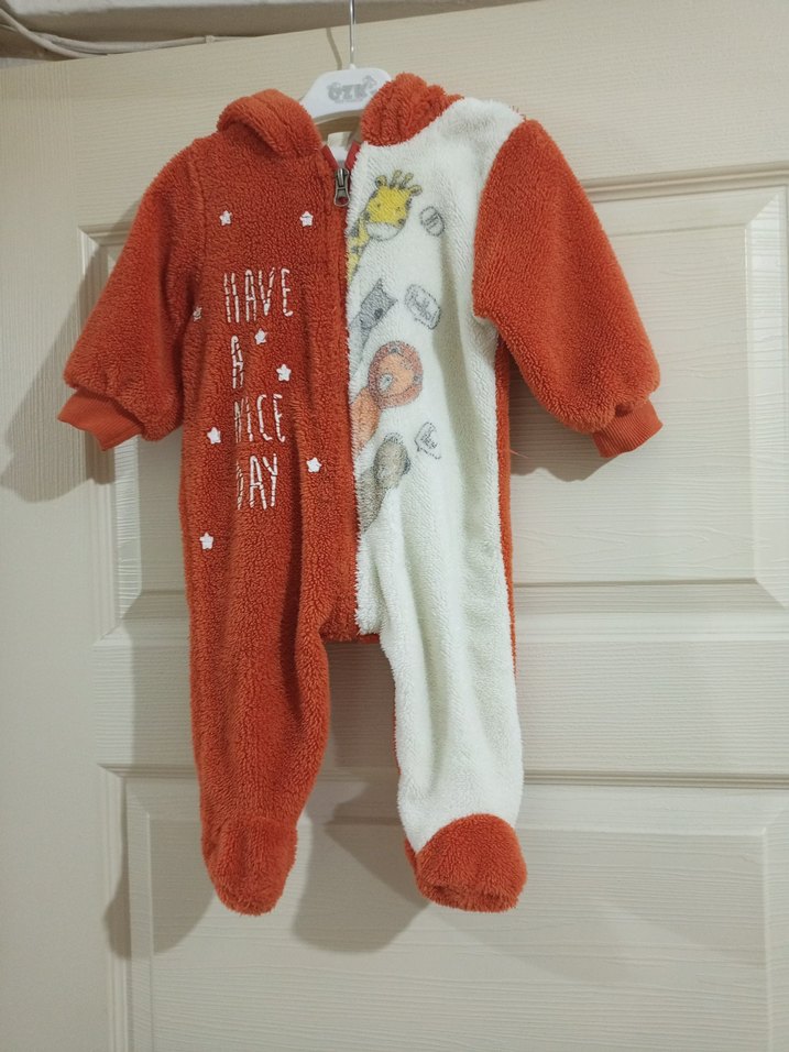 Turuncu ve beyaz renklerde, yumuşak polar kumaştan yapılmış örgü detaylı bebek tulumu. Kapüşonlu ve baskılı deseni ile tam koruma sağlar. 'HAVE A NICE DAY' yazılıdır.