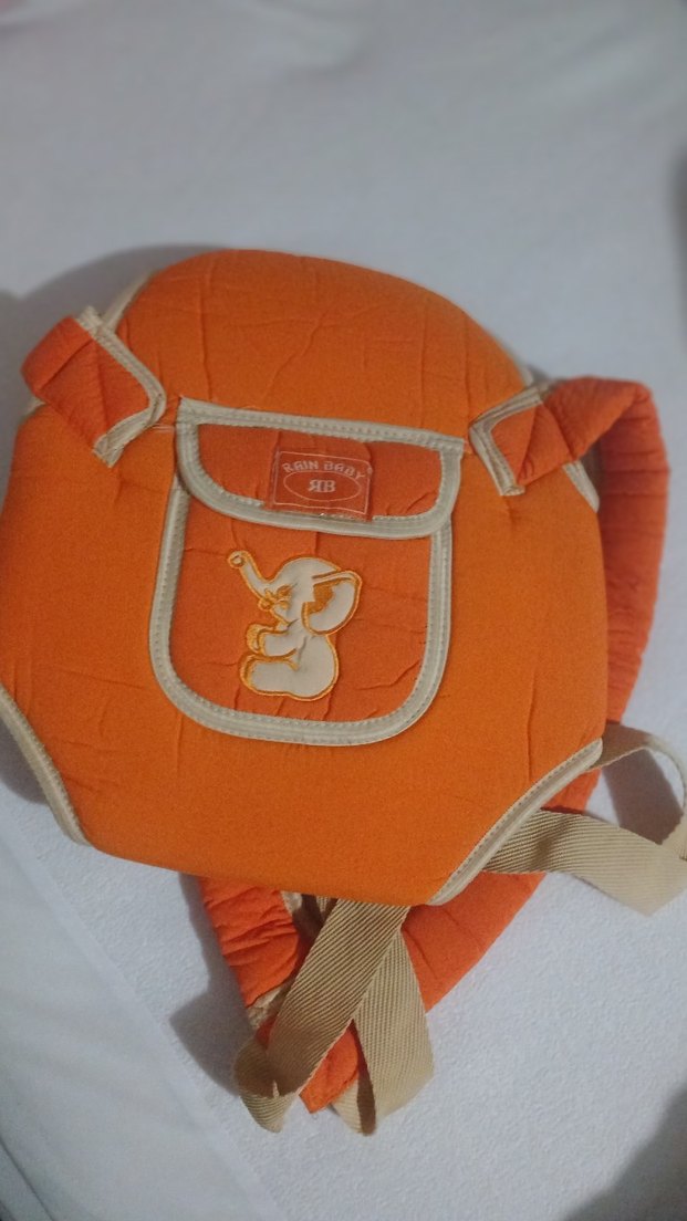 Renkli turuncu bebek taşıyıcı, dolgulu askılar ve önünde fil desenli cep ile konforlu kullanım sağlar.