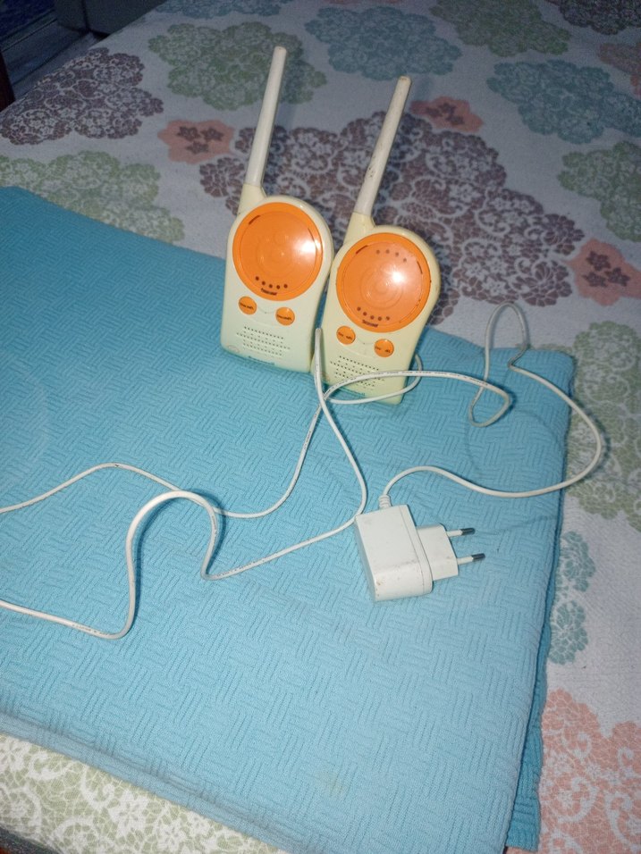 Turuncu pastel renkte, antenli ve şarj cihazı bulunan iki parçalı bebek telsizi seti.
