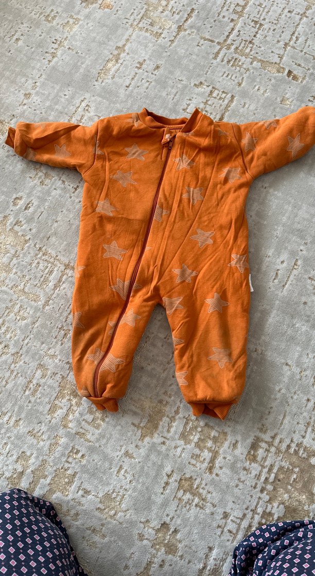 Turuncu renkli bebek tulumu, fermuarlı ve yumuşak, sıcak tutan kumaştan yapılmıştır. Hafif yıldız desenleriyle rahat kullanım sağlar. 1 yaş uyku tulumu