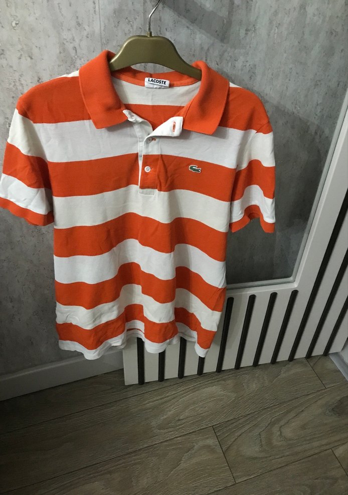 Dar kesim, kısa kollu, yakalı Lacoste polo tişört, turuncu beyaz çizgili ve pamuklu kumaştan. Düğmeli detaylarıyla gündelik sokak tarzına uygundur. Defosu var resimde görülüyor
