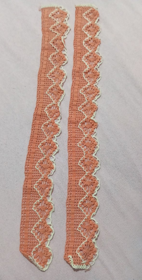Turuncu ve beyaz renklerde, yumuşak ipliklerle el yapımı dantel şerit. Dekoratif kullanıma uygundur. Havlu kenarıdır.