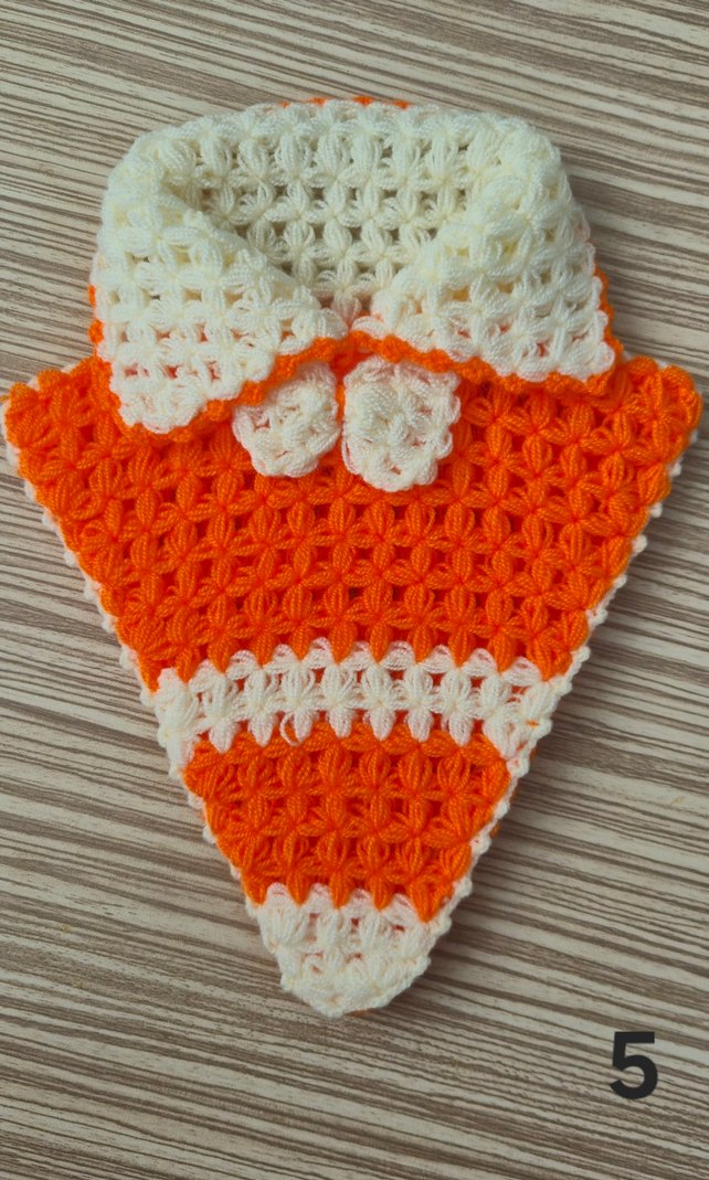 Canlı turuncu ve beyaz renklerde, el örgüsü dokusuna sahip banyo lifi. Üçgen şekilli, yakalı ve fiyonk detaylıdır.