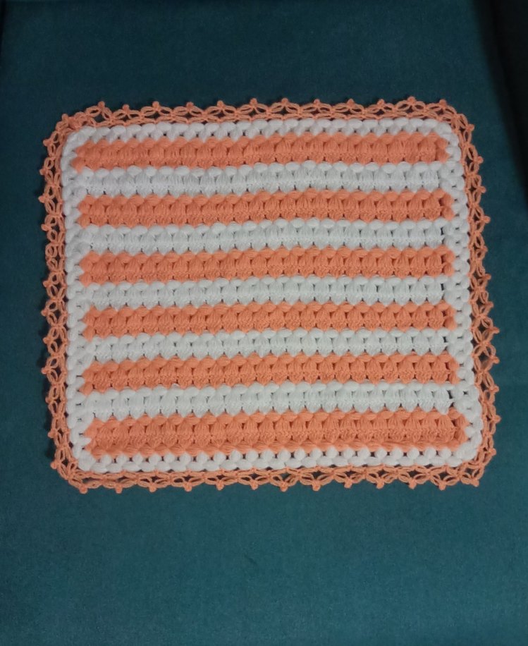 Turuncu ve beyaz şeritlerden oluşan el örgüsü banyo süngeri, yumuşak dokusuyla nazik temizlik sağlar.