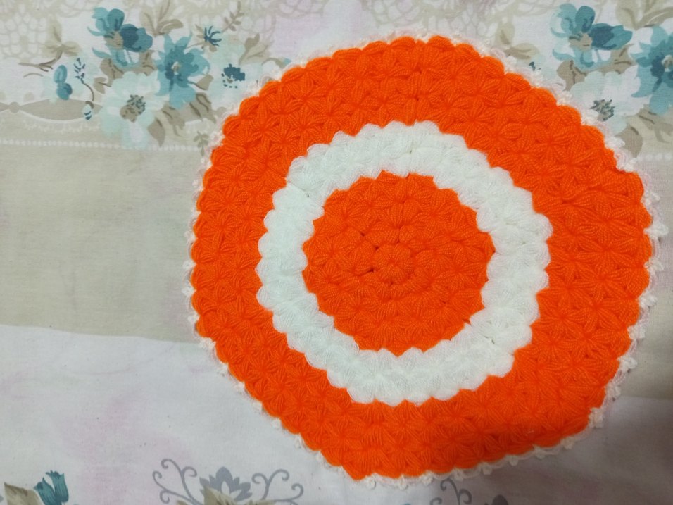 Yumuşak dokulu turuncu ve beyaz renklerde, dairesel desenli banyo süngeri.
