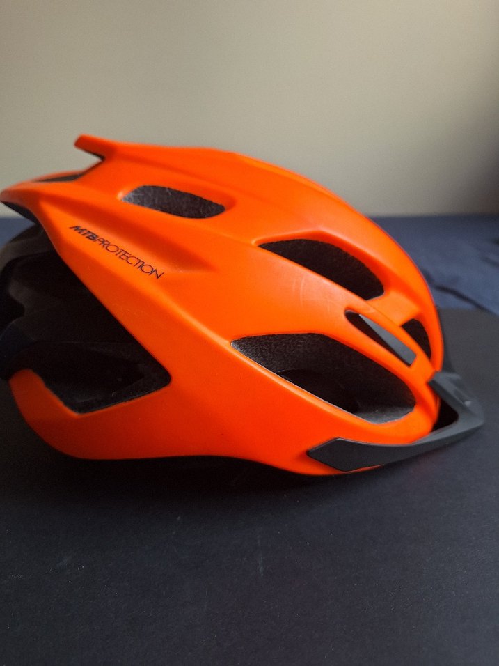 Turuncu renkli, desen içermeyen biker motosiklet kaskı, sağlam plastikten yapılmıştır ve velcro kayışlarla güvenli tutuş sağlar. Havalandırma delikleri bulunur. ️Decathlon Btwin marka. 53-59 cm. Çok iyi durumda.