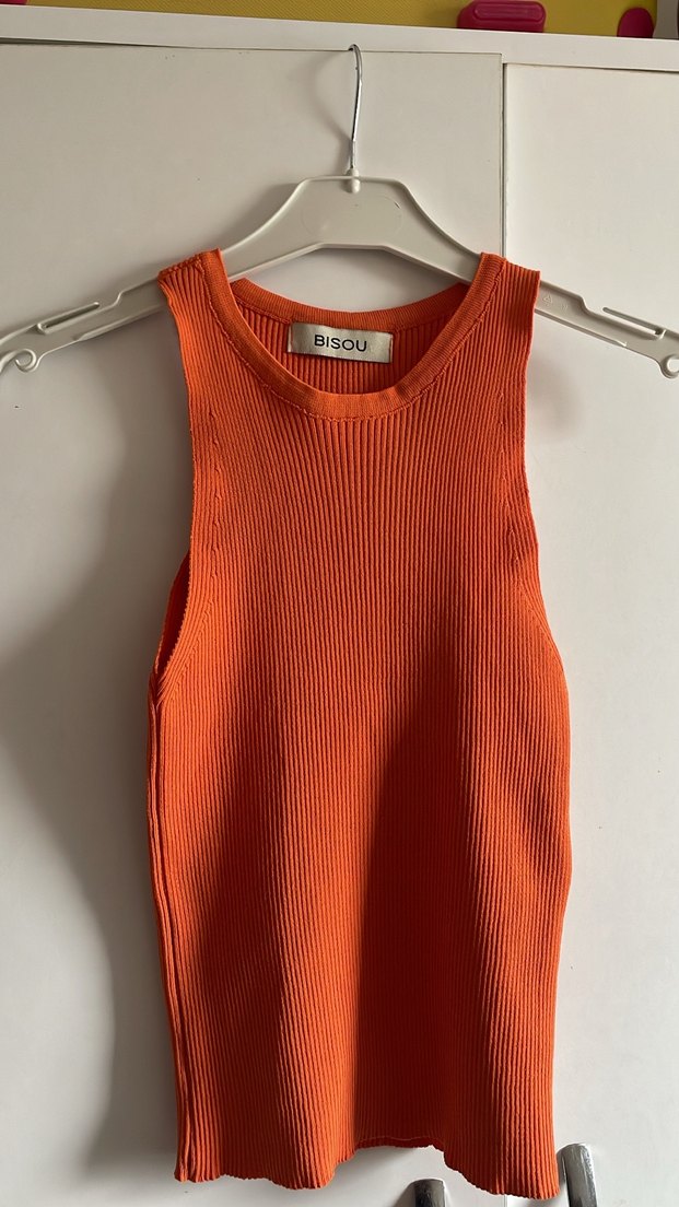 Bisou markalı, kolsuz, triko kumaştan, parlak turuncu renkte, yuvarlak yakalı, midi boy, sade ve dar kesim elbise.
