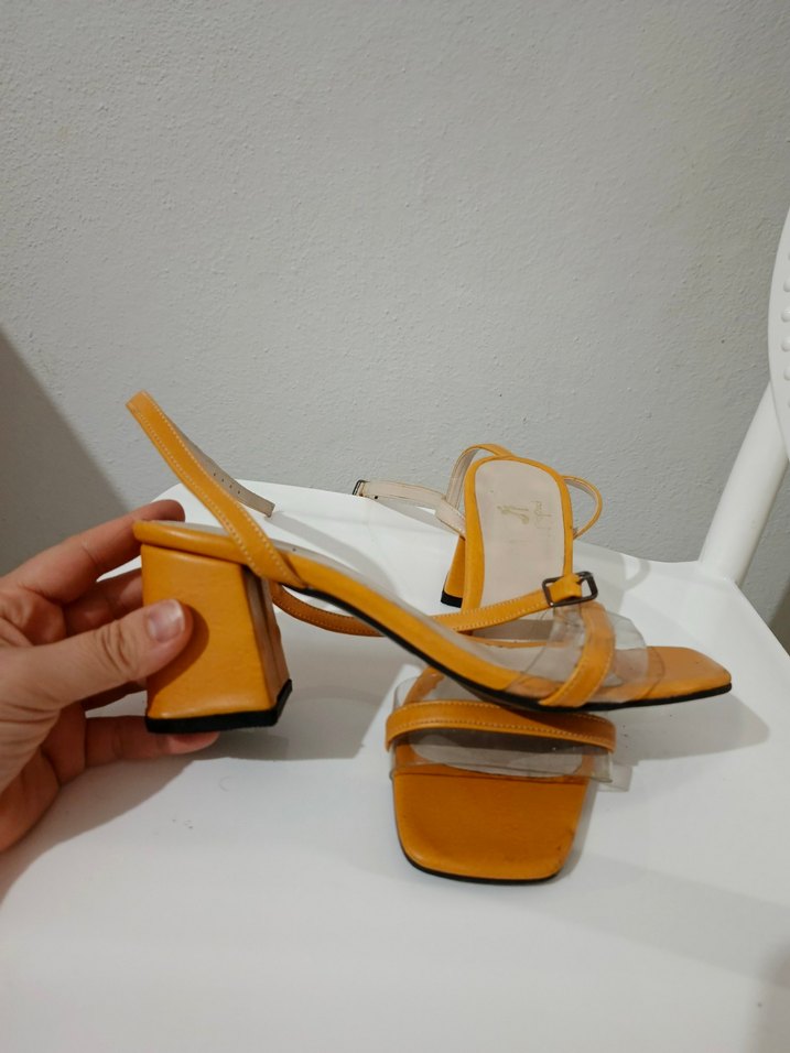 Turuncu blok topuklu kadın sandalet, tokalı ve şeffaf detaylı, çağdaş minimalist tasarıma sahip. Yumuşak kauçuk malzemeden üretilmiş, günlük kullanım için uygun.