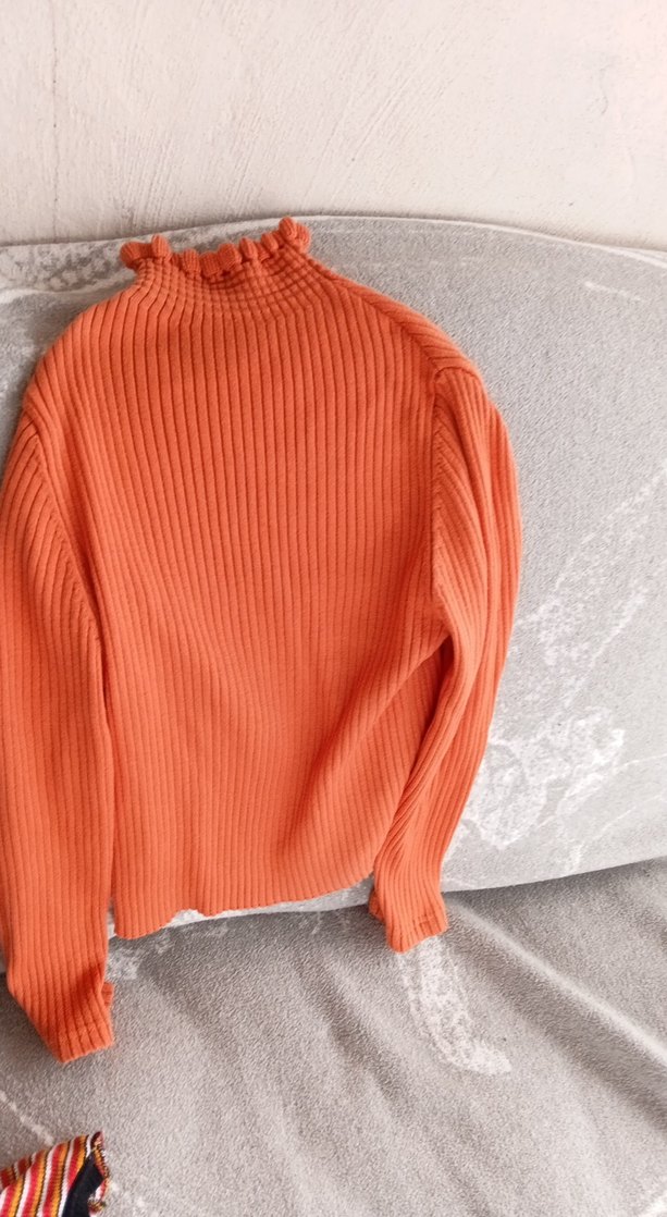 Boğazlı, uzun kollu, turuncu renkli, triko dokulu kadın kazağıdır. Normal boyda ve vücuda oturan kesime sahiptir, günlük kullanıma uygundur.
