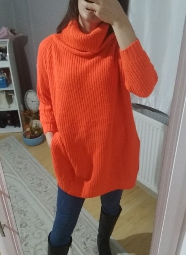 Salaş kesim, boğazlı ve uzun kollu bu kazak, yumuşak örgü kumaştan yapılmıştır. Canlı turuncu rengi gündelik sokak stiline enerji katar.