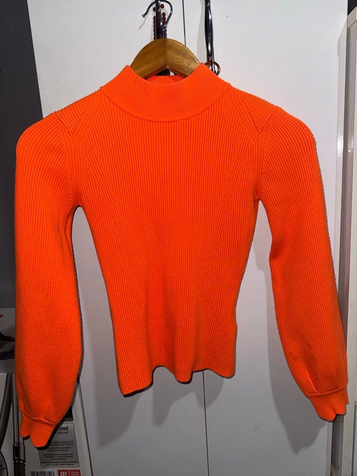 Boğazlı, uzun kollu, triko yapıda ve yün kumaştan yapılmış turuncu, parlak renkli kadın kazak. Sokak modasına uygun, rahat ve şık bir parça. Orjinaldir.