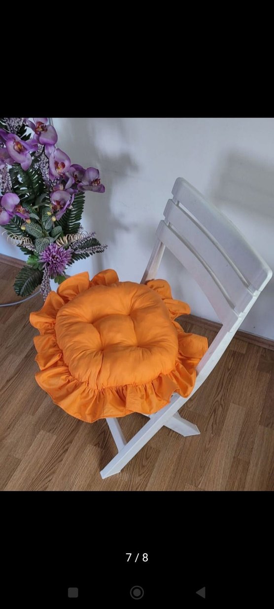Turuncu bohem tarzında, çiçek desenli ve fırfırlı kenarlı renkli minder, oturma alanına konfor ve şıklık katıyor.