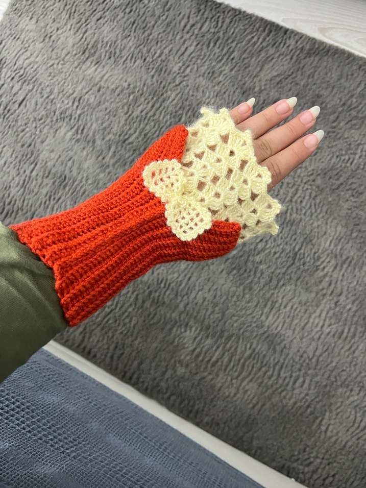 Kadınlar için turuncu örgü eldiven, krem renkli zarif tığ işi detaylarla bohem ve retro tarzı bir araya getirir. İstenilen renkte, yeni yapılacaktır. ☺️