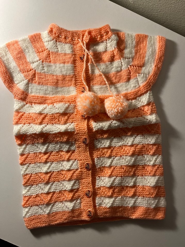 Turuncu ve beyaz pastel tonlarında, kolsuz ve fitted kesim kız çocuk örgü yelek. Düğmeli ön kısmı ve ponpon detaylarıyla bohem tarzı yansıtıyor.