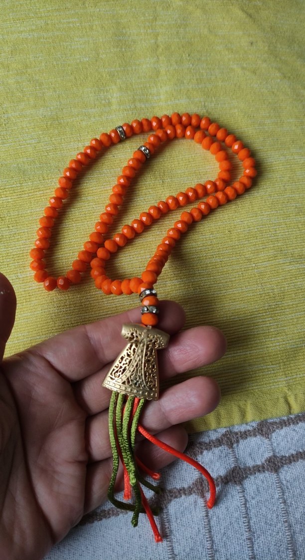 Renkli turuncu boncuklardan oluşan, detaylı metal püskülü ve çok renkli ipleriyle bohem tarzını yansıtan tespih ama bı boncuğu fazla kolye olarakda kullanılabilir kendi tasarimimdir