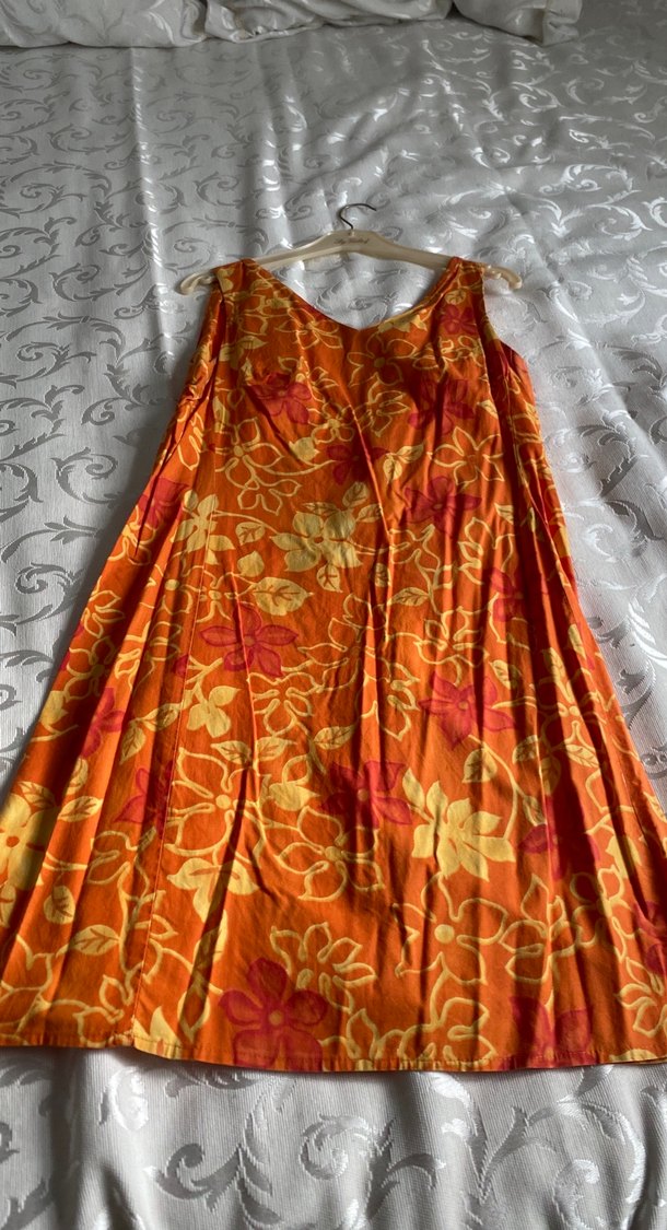 Turuncu canlı tie-dye çiçek desenli, mini, kolsuz, salaş kesim bohem elbise. Günlük kullanım için uygundur.