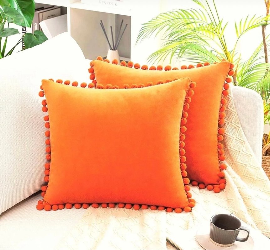 İstenilen Renk seçeneği için mesaj yazmanız yeterli… Canlı turuncu renkte, nakışlı ve ponponlu kenar detaylarına sahip bohem tarzda dekoratif yastık.