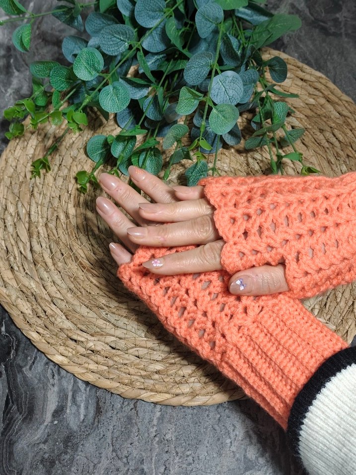 Turuncu renkli, bohem tarzda örgü kadın eldivenleri. Parmaksız yapısıyla retro ve hippie havası katar. Rahat ve sıcak örgü kumaştan üretilmiştir.