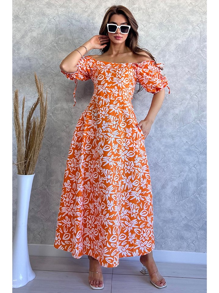 Kısa kollu, drapeli, askısız yakalı, batik desenli açık turuncu bohem uzun elbise. Günlük kullanım için uygundur.