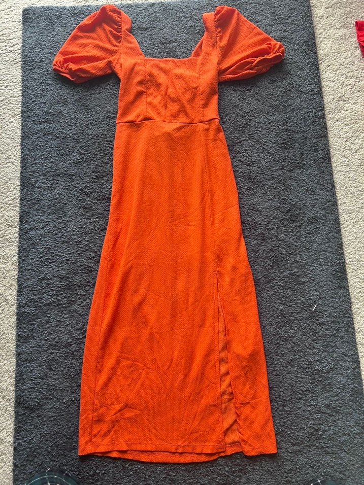 Dar kesim, uzun boylu elbise, kısa kabarık kollu ve tekne yakalıdır. Yumuşak sentetik kumaştan yapılmış, canlı turuncu renkte drapeli tasarıma sahiptir.