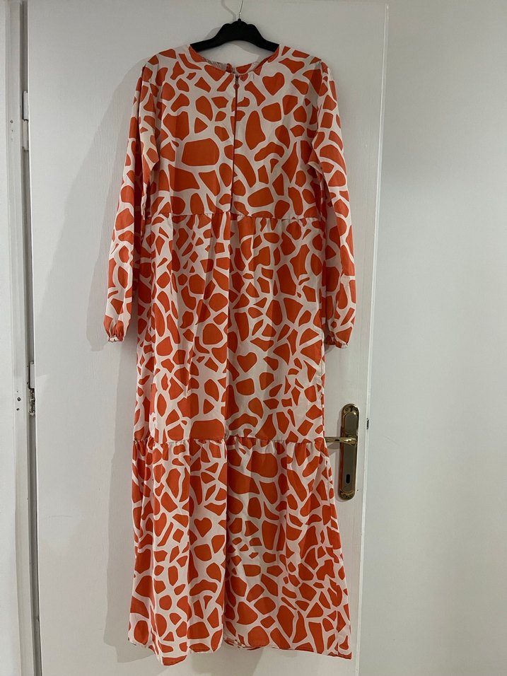 Renkli turuncu uzun elbise, bol kesim, uzun kollu ve yuvarlak yakalıdır. Bohem tarzda batik desenli, fırfır detaylı, sentetik kumaştan üretilmiştir. Günlük kullanım için uygundur.
