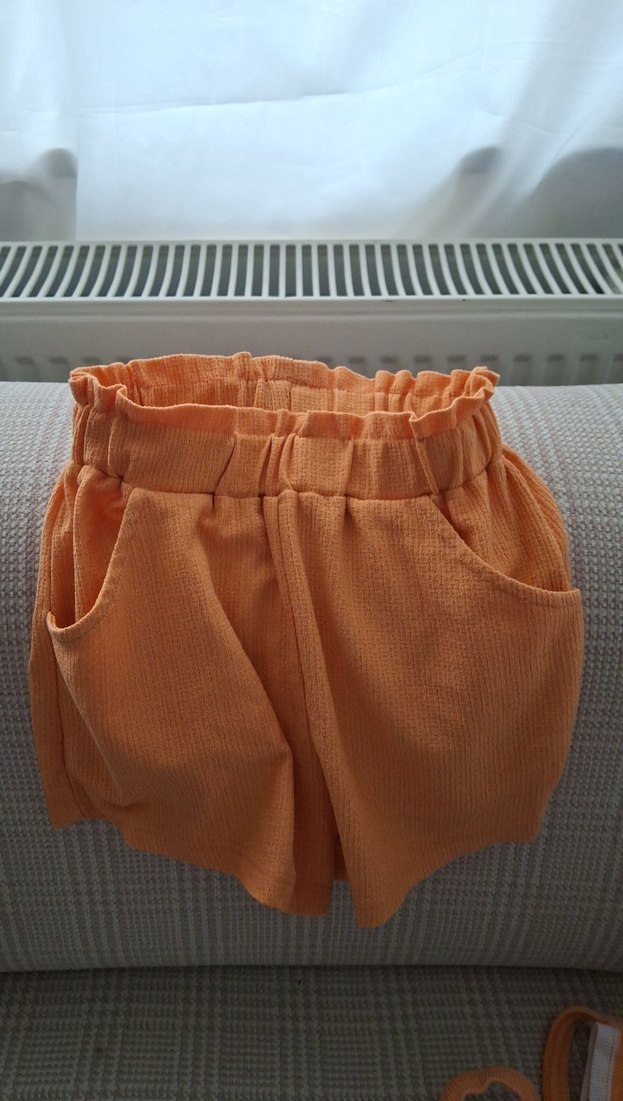 Turuncu renkte, bol kesim şort, pile detaylı ve mini boyda, rahat ve bohem tarzda günlük kullanım için uygundur.