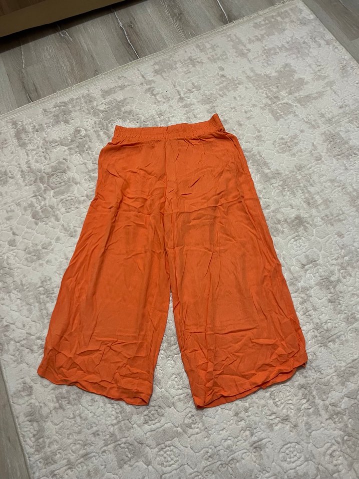 Turuncu renkli, bol kesim keten pantolon midi boyda, rahat ve bohem tarzda, dış mekan kullanımı için uygun.