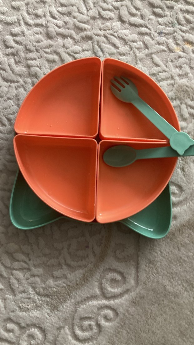 Pastel turuncu renkte, dört bölmeli çocuk tabağı seti ve uyumlu çatal-kaşık içerir. ️