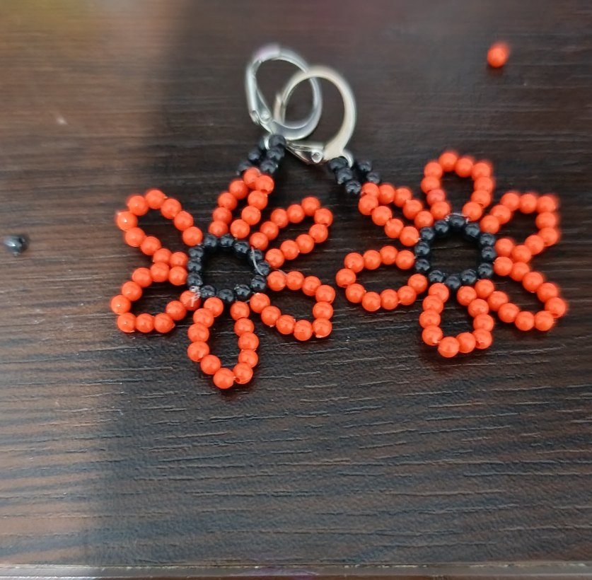 Turuncu ve siyah boncuklarla yapılmış kısa, çiçek şeklinde bohem tarzda küpeler, açık hava etkinlikleri için uygun.