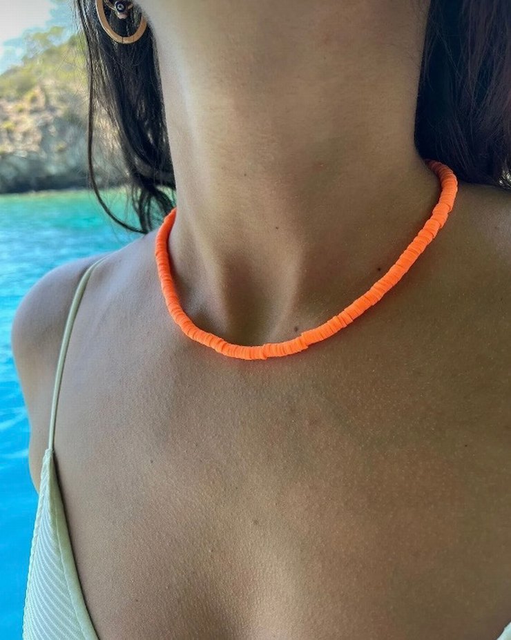 Canlı turuncu boncuklardan oluşan kısa, bohem tarzda kadın kolyesi. Plajda kullanıma uygun, retro havası taşıyor.