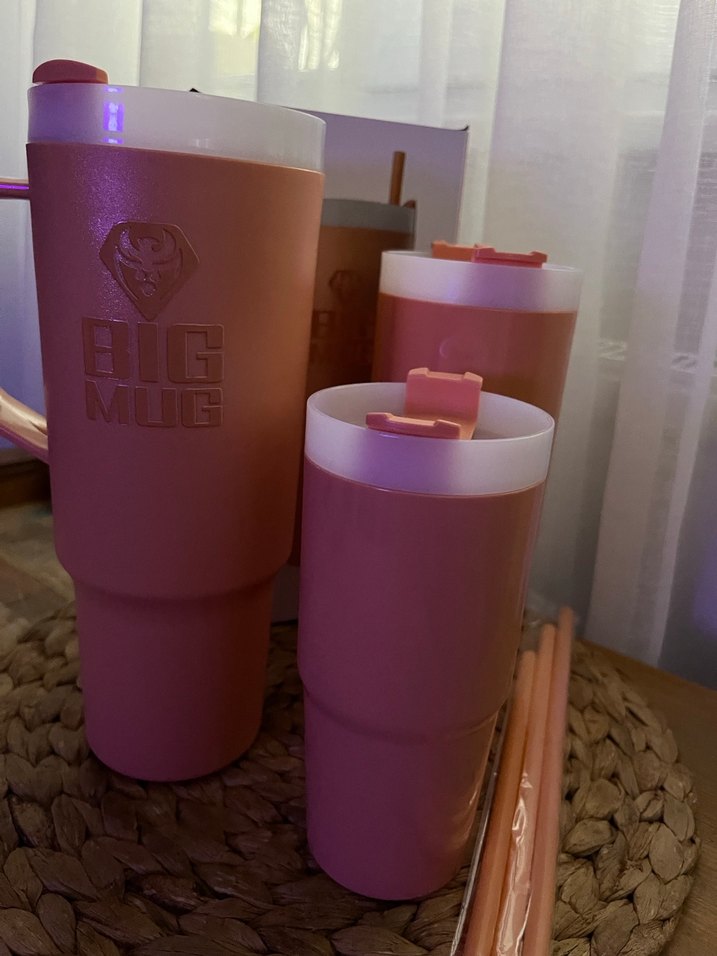 Kilitli kapaklı Açık turuncu termos kupalar, içecekleri sıcak veya soğuk tutar. Set içinde pipetler bulunur. ☕