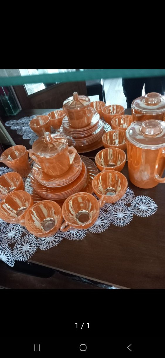 Turuncu camdan yapılmış, içinde fincanlar, tabaklar, ve şekerlik bulunan çay seti. Canlı ve açık turuncu renktedir. 23 parça defosuz sağdaki çaydanlık satilmistir